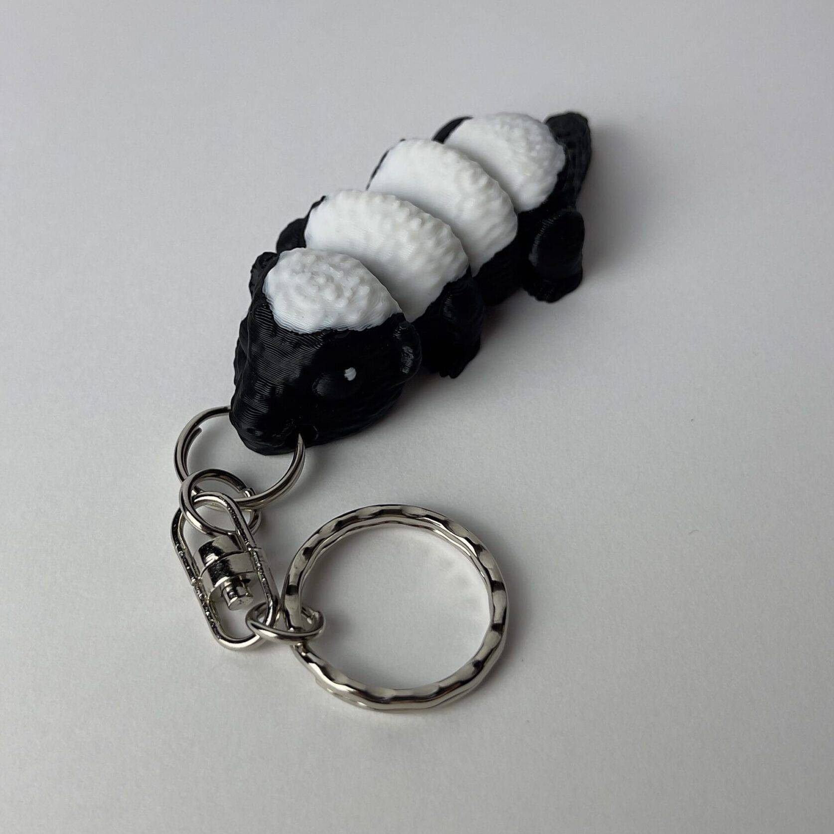 Ez a fekete-fehér borz kulcstartó egyszerre különleges és szerethető. Játékos kialakítása és mozgatható teste igazi kedvencé válik mindazoknak, akik szeretik az erdők rejtélyes kis lakóit.